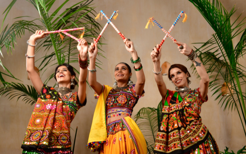 -“Garba and Dandiya Raas”:- In Gujarat and many parts of North India, evenings are filled with vibrant dance performances, where men and women in colorful attire celebrate with traditional steps.