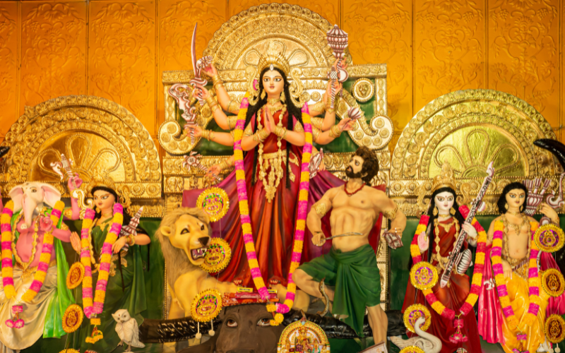 -“Daily Puja”:- Each day, devotees worship one form of Maa Durga with prayers, flowers, incense, and devotional songs.